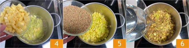 Fügen Sie die Kartoffeln in den Topf 4. Geben Sie auch die abgespülten Linsen 5 und das Wasser 6 hinzu.