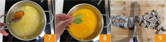Würzen Sie mit Kurkuma 7 und Lorbeerblättern 8, rühren Sie um und lassen Sie die Suppe auf mittlerer bis niedriger Hitze für 25-30 Minuten köcheln, wobei Sie gelegentlich umrühren. Fügen Sie jetzt kein Salz hinzu, da die Linsen sonst hart bleiben. In der Zwischenzeit bereiten Sie die Croutons vor: Schneiden Sie das Brot in Würfel 9.