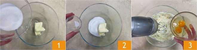 Um die Linzer Torte zuzubereiten, gebt in eine Schüssel die weiche Butter, den Zucker 1 und das Salz 2 und schlagt alles mit dem Handrührgerät für ein paar Minuten. Gebt die Eier (auf Zimmertemperatur) 3 dazu und rührt, bis sie vollständig eingearbeitet sind.