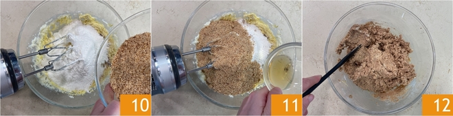 Gebt außerdem Mehl (Tipo 00) und Haselnussmehl 10 dazu. Aromatisiert zum Schluss mit dem Brandy 11 und verarbeitet alles noch einmal mit den Rührbesen. Ihr solltet eine weiche, homogene Masse erhalten 12.