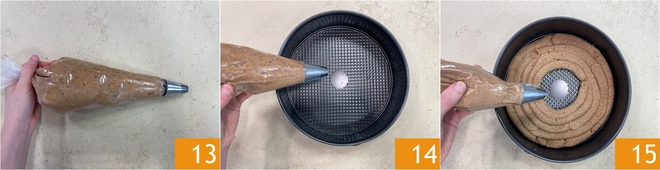 Füllt drei Viertel des Teigs in einen Spritzbeutel mit einer 15-mm-Tülle 13. Bedeckt damit den Boden einer 24-cm-Form 14 (am besten mit herausnehmbarem Ring) in konzentrischen Kreisen und beginnt am Rand der Form 15.