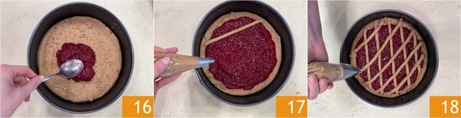 Jetzt füllt ihr den Boden mit der Konfitüre und lasst dabei rundum 1,5 cm Platz bis zum Rand 16. Stellt den restlichen Teig beiseite, er wird für den Rand gebraucht. Füllt den beiseitegelegten Teig (ein Viertel) in einen zweiten Spritzbeutel mit 1‑cm-Tülle und setzt die dekorativen Rauten zuerst in eine Richtung 17 und dann in die andere 18.