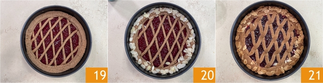 Jetzt nehmt ihr wieder den ersten Spritzbeutel mit 15-mm-Tülle und formt den Rand der Torte 19. Zum Schluss den Rand mit Mandelblättchen bestreuen 20. Backt die Linzer Torte im vorgeheizten Backofen (Ober-/Unterhitze) bei 180 °C für 50–55 Minuten. Herausnehmen 21 und vor dem Ausformen etwas abkühlen lassen. Sobald sie kalt ist, könnt ihr sie mit etwas Puderzucker bestäuben!