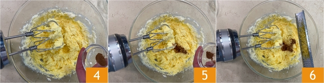 Gebt zum Teig Zimt 4, Nelken 5 und die abgeriebene Zitronenschale 6 dazu.