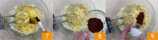 Gebt außerdem das Mark der Vanilleschote 7 dazu. Während ihr weiter rührt, gebt Kakao 8 und Backpulver 9 dazu.
