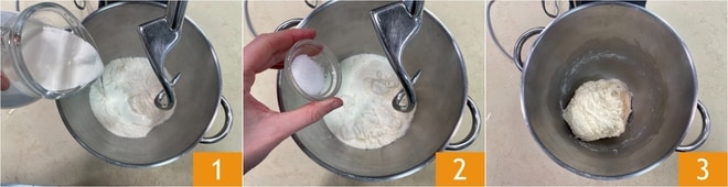 Um das lodigianische Osterlamm zuzubereiten, beginnen Sie mit dem Blätterteig: Geben Sie das Mehl, die flüssige frische Sahne 1 und das Salz 2 in die Schüssel der Küchenmaschine mit Knethaken, dann schalten Sie die Maschine ein, bis Sie einen weichen und homogenen Teig 3 erhalten.