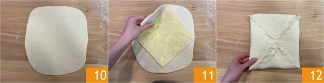 Rollen Sie den Teig 10 aus, bis er groß genug ist, um den Butterblock diagonal 11 einzufügen, und schließen Sie dann die Ränder des Teigs zur Mitte hin, um die Butter perfekt einzuschließen 12.