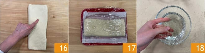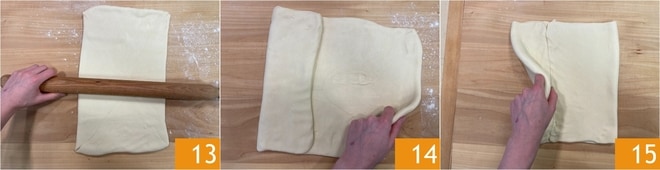 Bestäuben Sie die Arbeitsfläche mit etwas Mehl, geben Sie auch ein wenig darüber auf den Block und rollen Sie mit dem Nudelholz nur in die Richtung vor Ihnen, um ein längliches Rechteck zu erhalten, das nur in die Länge, nicht in die Breite geht 13: Falten Sie die beiden Seitenränder der kurzen Seite zur Mitte 14 15.