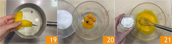 Erhitzen Sie die Milch mit der Vanilleschote, ohne Samen, und der Zitronenschale 19. In der Zwischenzeit geben Sie die Eier, die zuvor entnommenen Vanillemark und den Zucker 20 in eine Schüssel. Rühren Sie mit dem Schneebesen, um zu vermischen, und fügen Sie dann die Stärke hinzu 21.