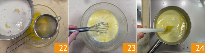 Gießen Sie die heiße Milch durch ein Sieb, das die Zitronenschale und die Vanilleschote zurückhält, über die Eiermischung 22, rühren Sie um, um zu vermischen 23 und stellen Sie es wieder auf den Herd 24.