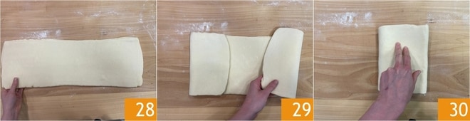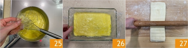 Die Creme eindicken lassen, dabei kontinuierlich mit dem Schneebesen rühren, dann die Hitze ausschalten und die abgetropfte und ausgedrückte Gelatine hinzufügen 25. Rühren Sie um, um sie aufzulösen, dann geben Sie die Creme in eine Auflaufform. Lassen Sie sie abkühlen, bedecken Sie sie dann mit Frischhaltefolie und stellen Sie sie in den Kühlschrank zum Festwerden 26. Nehmen Sie den Block und formen Sie die zweite Faltung des Blätterteigs in die Richtung der Falten 27.