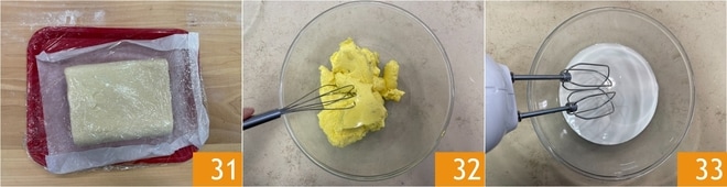 Lassen Sie ihn erneut 30 Minuten im Kühlschrank ruhen, indem Sie den Block mit Frischhaltefolie umhüllen 31. In der Zwischenzeit holen Sie die Creme und machen Sie sie mit dem Schneebesen weich 32. In einer separaten Schüssel schlagen Sie die Sahne mit dem Schneebesen 33.