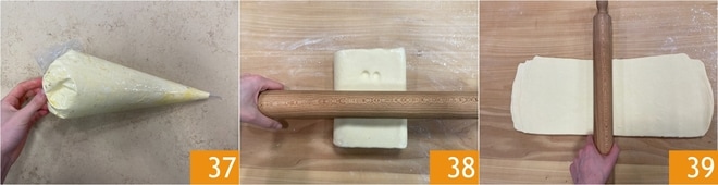 Geben Sie die diplomatische Creme in einen Spritzbeutel ohne Düse 37 und bewahren Sie sie im Kühlschrank bis zur Verwendung auf. Nehmen Sie den Block und formen Sie die dritte Faltung 38: Erstellen Sie wieder einen rechteckigen Blätterteig mit einer Dicke von 1 cm 39.