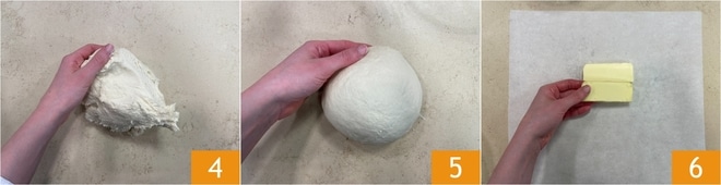 Übertragen Sie es auf die Arbeitsfläche 4 und kneten Sie es kurz, um einen Laib 5 zu formen. Lassen Sie es im Kühlschrank mit Frischhaltefolie bedeckt 30 Minuten ruhen. In der Zwischenzeit nehmen Sie ein Stück Backpapier und legen Sie die Butter in der Mitte ab 6.