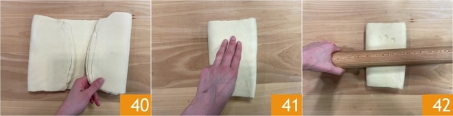 Falten Sie die Ränder zur Mitte 40, dann markieren Sie mit 3 Fingern die dritte und letzte Ruhephase 41. Lassen Sie ihn immer im Kühlschrank für 30 Minuten ruhen, bedeckt mit Frischhaltefolie. Nach dieser Zeit nehmen Sie den Block und rollen ihn mit dem Nudelholz auf der Arbeitsfläche aus 42.