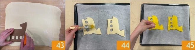 Nun müssen Sie einen Blätterteig mit einer Dicke von etwa 0,8 cm erhalten. Legen Sie hier die Pappschablone des Lammes auf, wir haben eine Zeichnung von 20x20 cm erstellt. Schneiden Sie den Teig mit einem Cuttermesser aus 43. Legen Sie die Blätterteigformen auf ein mit Backpapier ausgelegtes Blech, bestreichen Sie die Oberfläche mit etwas Eigelb 44 und bestreuen Sie sie mit Kristallzucker 45.