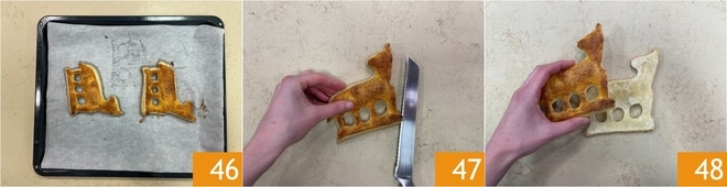 Backen Sie die Blätterteiglämmer im vorgeheizten Umluftofen bei 180° für 20 Minuten. Sobald sie gebacken sind, nehmen Sie sie heraus und lassen Sie sie vollständig abkühlen 46. Teilen Sie die Lämmer horizontal in zwei Hälften 47, damit Sie sie füllen können 48.