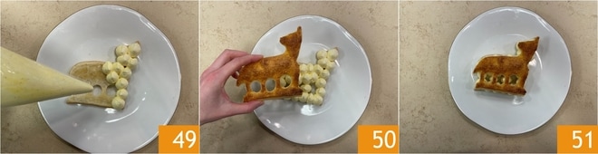 Jetzt füllen Sie die untere Basis des Lammes mit Creme, indem Sie mit dem Spritzbeutel 49 Spitzen drücken. Schließen Sie mit der oberen Hälfte 50 und servieren Sie sofort das lodigianische Osterlamm 51!