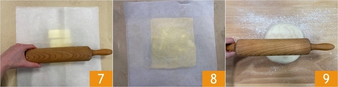 Bedecken Sie es mit einem weiteren Blatt Backpapier 7 und rollen Sie den Butterblock mit dem Nudelholz aus, um ihn dünner zu machen 8, dann legen Sie ihn für 15 Minuten in den Kühlschrank. Sobald er geruht hat, rollen Sie den Teig auf der bemehlten Arbeitsfläche mit dem Nudelholz aus 9.