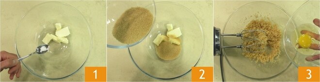 Um die Löffelkekse zuzubereiten, stellen Sie zunächst sicher, dass die Zutaten Raumtemperatur haben. In einer Schüssel mischen Sie die weiche Butter mit dem Salz 1 und dem braunen Zucker 2 und verarbeiten dies für ein paar Minuten mit den elektrischen Schneebesen, dann geben Sie das Ei dazu 3 und mischen für eine weitere Minute.