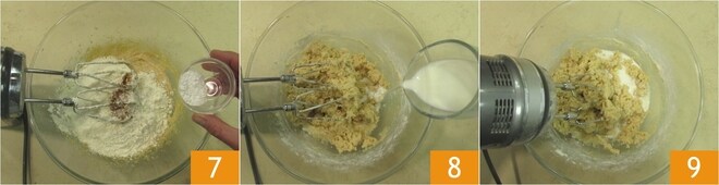 Fügen Sie auch das Backpulver 7 hinzu und während Sie alles mit den Schneebesen mischen, geben Sie die Milch nach und nach hinzu 8. Arbeiten Sie weiter 9, bis Sie eine homogene Masse erhalten.