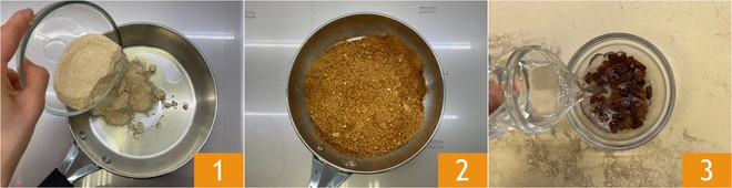Um die Schweinelende a beccafico zuzubereiten, kümmern Sie sich zuerst um die Füllung. Geben Sie einen Schuss Öl in eine Pfanne und fügen Sie die Semmelbrösel hinzu 1. Braten Sie sie einige Minuten an, bis sie knusprig und goldbraun sind 2, rühren Sie häufig um, damit sie nicht verbrennen. Lassen Sie sie abkühlen. Geben Sie unterdessen die Rosinen in eine Schüssel und bedecken Sie sie mit lauwarmem Wasser 3, um sie einzuweichen.