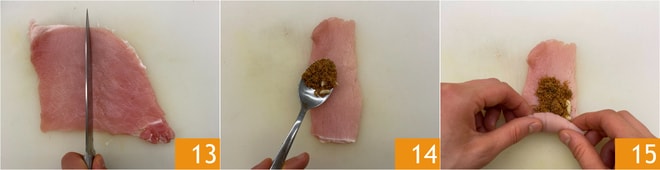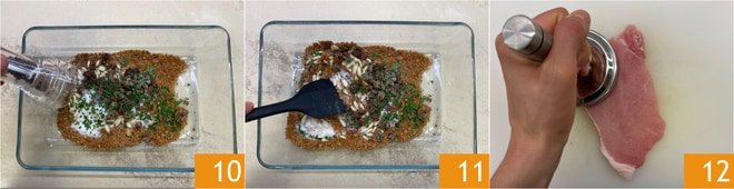 Mit Salz und Pfeffer abschmecken 10 und gut mischen 11. Klopfen Sie die Schweinelendenscheiben leicht, um sie noch dünner und zarter zu machen 12.