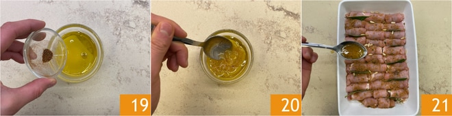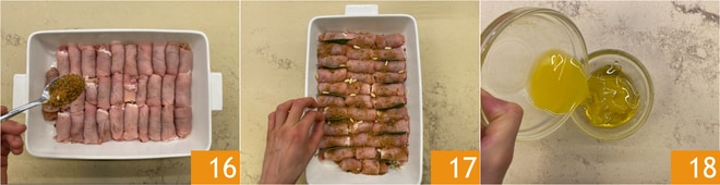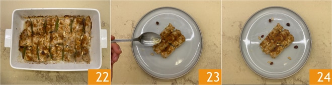 Fetten Sie eine Backform mit einem Schuss Öl ein und legen Sie die Röllchen nebeneinander, würzen Sie sie mit der Füllung 16, Pinienkernen und ein paar Lorbeerblättern zwischen den Röllchen 17. Geben Sie in eine kleine Schüssel einen Schuss Öl, den Honig und den Orangensaft 18.