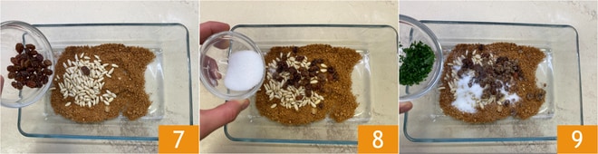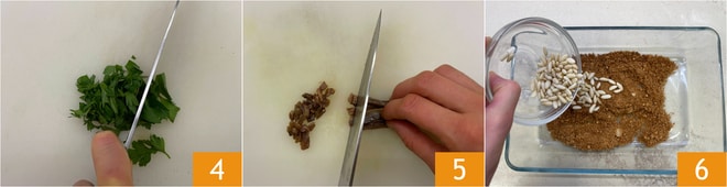 Hacke die Petersilie 4 und die Sardellen 5 mit einem Messer klein. Geben Sie die Semmelbrösel in eine Schüssel und fügen Sie die Pinienkerne hinzu 6.