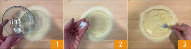 Um die Lorighittas mit Meeresfrüchtesauce zuzubereiten, geben Sie zuerst das Hartweizengrieß auf das Nudelbrett, formen Sie eine Mulde und gießen Sie das Wasser 1, das Salz 2 hinein und beginnen Sie, den Grieß mit einer Gabel zu vermengen 3.