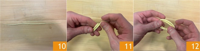 Formen Sie mit jedem Stück einen etwa 20 cm langen und 2 mm dicken Spaghetto 10. Wickeln Sie den Spaghetto zweimal um drei zusammengelegte Finger (Zeige-, Mittel- und Ringfinger) 11, drücken Sie dann die Enden zum Versiegeln zusammen 12 und entfernen Sie den überschüssigen Teig.