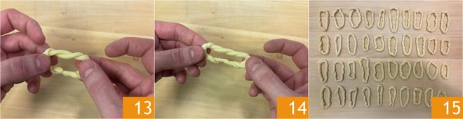 Halten Sie mit einer Hand den Teig fest, während Sie mit der anderen Hand die beiden Fäden des Rings 13 drehen, als ob Sie eine antike Uhr aufziehen würden, bis der Teig die typische verdrehte und leicht verlängerte Form der Lorighittas 14 annimmt. Legen Sie sie ordentlich auf das Nudelbrett und lassen Sie sie trocknen 15.