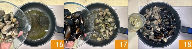 Inzwischen geben Sie einen Schuss Öl in eine Pfanne und fügen die Venusmuscheln 16 und die Miesmuscheln 17 hinzu. Wenn sie sich geöffnet haben, löschen Sie mit Weißwein ab 18. Lassen Sie den gesamten Alkohol verdunsten.