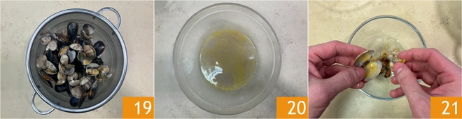 Filtrieren Sie alles 19 und bewahren Sie das Kochwasser 20 auf. Entfernen Sie die Schalen von Mies- und Venusmuscheln 21, aber bewahren Sie einige mit Schale zur finalen Präsentation auf.