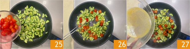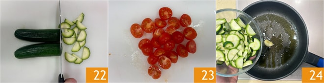 Schneiden Sie die Zucchini in Halbmonde 22 und die Kirschtomaten in Hälften 23. Geben Sie einen Schuss Öl in eine Pfanne, fügen Sie eine Knoblauchzehe hinzu und braten Sie sie einige Minuten lang an, dann geben Sie die Zucchini 24 hinzu und braten sie einige Minuten lang, bis sie goldbraun werden.