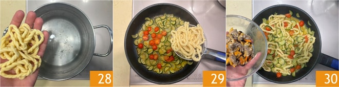 Kochen Sie die Lorighittas in reichlich gesalzenem kochendem Wasser für 4-5 Minuten 28, seihen Sie sie ab und geben Sie sie in die Pfanne 29. Fügen Sie die Mies- und Venusmuscheln hinzu 30 und schwenken alles für einige Minuten.