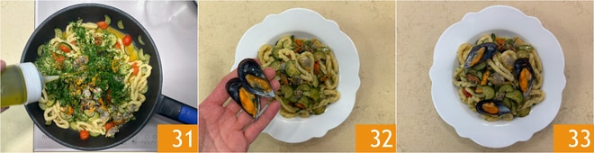 Schalten Sie die Hitze aus, fügen Sie die gehackte Petersilie und einen Schuss Öl hinzu 31 und vermengen alles. Servieren Sie das Gericht und garnieren Sie es mit einigen Muscheln mit Schale 32. Ihre Lorighittas mit Meeresfrüchtesauce sind bereit zum Genießen 33.