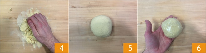 Kneten Sie dann mit den Händen 4 mindestens 15 Minuten lang, bis Sie einen homogenen und elastischen Teigklumpen 5 erhalten. Decken Sie ihn mit Frischhaltefolie ab 6 und lassen Sie ihn 30 Minuten im Kühlschrank ruhen.