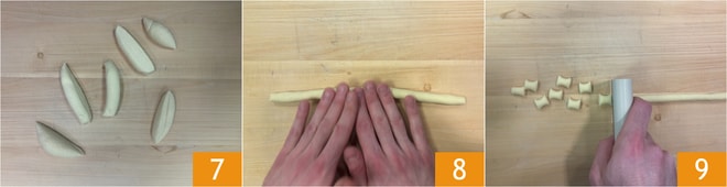 Nach der Ruhezeit nehmen Sie den Teigklumpen und schneiden Sie ihn mit einem Teigschaber in Stücke 7, formen dann Bigoli 8 und schneiden diese in Stücke 9.