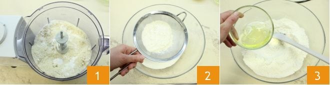 Um die Macarons mit Salzkaramell herzustellen, beginnen Sie mit der Zubereitung der Macarons-Schalen: Mahlen Sie das Mandelmehl mit dem Puderzucker 1, um eine feinere Mischung zu erhalten, und sieben Sie sie dann mit einem grobmaschigen Sieb 2, fügen Sie 75 g Eiweiß hinzu 3
