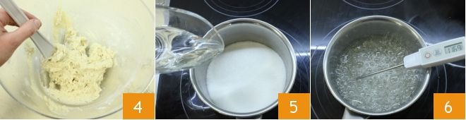 mischen Sie die Mischung mit einem Holzlöffel, um die Zutaten zu verbinden 4. Decken Sie die Mischung mit Frischhaltefolie ab und lassen Sie sie bei Raumtemperatur stehen. Nun kümmern Sie sich um den Zuckersirup. Stellen Sie einen kleinen Topf auf den Herd, geben Sie den Zucker und das Wasser 5 hinzu und bringen Sie den Sirup auf 121°C. Um die Temperatur zu überprüfen, verwenden Sie ein Lebensmittelthermometer. Wenn der Sirup 116°C erreicht 6