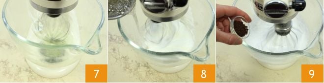 beginnen Sie, die restlichen 75 g Eiweiß mit einer Küchenmaschine 7 oder einem elektrischen Handmixer zu schlagen. Wenn der Sirup 121°C erreicht hat, gießen Sie ihn langsam in die Küchenmaschine mit dem Eiweiß 8 und schlagen Sie weiter; fügen Sie das lösliche Kaffeepulver hinzu 9, bis der Sirup abgekühlt ist und das Baiser glänzend und schaumig ist.