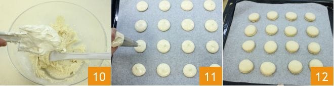 Inkorporieren Sie das Baiser nach und nach in die Mandelmehlmischung 10 und rühren Sie vorsichtig mit einem Spatel, um einen weichen und glatten Teig zu erhalten. Geben Sie die Mischung in einen Spritzbeutel mit glatter Tülle, bereiten Sie dann ein mit Backpapier ausgelegtes Backblech vor und buttern Sie das Blech, damit das Papier besser haftet. Spritzen Sie auf das Blech kleine, gut auseinanderliegende Kreise von etwa 4 cm Durchmesser 11. Lassen Sie die Häufchen mindestens 20 Minuten auf einem mit Backpapier ausgelegten Blech ruhen, damit sie sich leicht abflachen und die Oberfläche perfekt glatt wird. Backen Sie die Macarons in einem vorgeheizten Umluftofen bei 160°C für 10 Minuten (es wird nicht empfohlen, den Ofen im statischen Modus zu verwenden). Schalten Sie nach dem Backen den Ofen aus und lassen Sie die Macarons für weitere zwei Minuten bei halb geöffneter Ofentür im Ofen, um sie trocknen zu lassen (um sich bei dieser Operation zu helfen, können Sie einen Kochlöffel in die Öffnung stecken, damit die Ofentür leicht geöffnet bleibt). Sobald sie getrocknet sind, nehmen Sie die Macarons aus dem Ofen 12 und lassen Sie sie auf einem Gitter abkühlen.