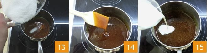 Nun kümmern Sie sich um das Karamell: Stellen Sie einen Topf auf den Herd und geben Sie nach und nach den Zucker hinein 13 und lassen Sie ihn bei niedriger Hitze schmelzen und bräunen. Rühren Sie den Zucker in dieser Phase der Zubereitung nie um, sondern schwenken Sie nur den Topf. Erhitzen Sie inzwischen die Sahne und wenn das Karamell glatt ist 14, fügen Sie die heiße Sahne hinzu 15.