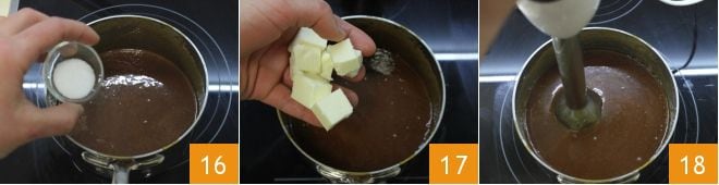 Rühren Sie den Sirup mit einem Schneebesen und fügen Sie das Salz 16 und die in kleine Würfel geschnittene kalte Butter 17 hinzu. Rühren Sie weiter, bis Sie eine homogene und glatte Mischung erhalten, emulgieren Sie dann mit einem Stabmixer 18.