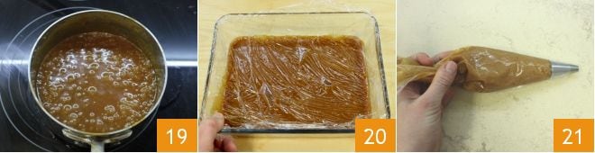 Jetzt ist der Sirup bereit 19, geben Sie ihn in eine flache und breite Schüssel, decken Sie ihn mit Frischhaltefolie ab 20 und stellen Sie ihn in den Kühlschrank, um fest zu werden. Setzen Sie die Macarons zusammen: Geben Sie das Karamell in einen Spritzbeutel mit glatter Tülle 21.