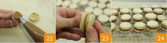 Füllen Sie die Macarons, indem Sie einen Tupfer Karamell auf die flache Seite der Hälfte der Scheiben spritzen 22 und schließen Sie mit einer anderen Scheibe, indem Sie leicht drücken 23. Ihre Kaffee-Salzkaramell-Macarons sind bereit zum Genießen 24.