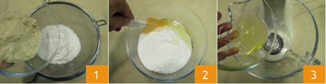 Um die Caprese Macarons zuzubereiten, beginnt mit den Meringue-Schalen. Sieben Sie den Puderzucker und das Mandelmehl mit einem feinen Sieb in eine Schüssel 1. Dann fügen Sie 75 g Eiweiß hinzu 2 und mischen Sie die Zutaten mit einem Spatel gut durch, bis Sie eine homogene Masse erhalten. Stellen Sie die Mischung beiseite. Nehmen Sie jetzt eine Küchenmaschine und geben Sie die restlichen 75 g Eiweiß hinein 3.