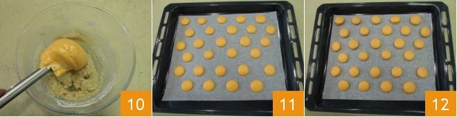 Schließlich fügen Sie die gefärbte Meringue zur ersten Mischung mit Mandelmehl, Eiweiß und Puderzucker hinzu 10. Helfen Sie sich mit einem Spatel und machen Sie eine sanfte Bewegung von unten nach oben, um das Eiweiß nicht zu entlüften. Füllen Sie die Mischung in einen Spritzbeutel mit glatter Tülle von 10 mm und formen Sie kleine Scheiben mit einem Durchmesser von 2 cm auf ein mit Backpapier ausgelegtes Backblech, wobei Sie die Scheiben mindestens 2-3 cm voneinander entfernt platzieren 11: mit unseren Mengen sollten Sie etwa 70 Schalen erhalten. Um die Meringue-Schalen leicht zu glätten, klopfen Sie leicht mit der Handfläche auf den Boden des Backblechs oder klopfen Sie es sanft auf die Arbeitsfläche. Backen Sie im Umluftofen bei 160° für 12-13 Minuten (es wird nicht empfohlen, den Ofen im statischen Modus zu verwenden). Nach dem Backen nehmen Sie das Backblech heraus und lassen es bei Raumtemperatur abkühlen 12.