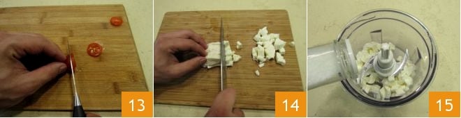 Während die Macarons abkühlen, bereiten Sie die Käsecreme für die Füllung vor. Schneiden Sie die Kirschtomaten in gleich große Scheiben in horizontalem Sinne 13 und stellen Sie sie beiseite. Dann schneiden Sie den Mozzarella in kleine Würfel von 1 cm Seitenlänge 14 und geben Sie ihn in einen Mixer. Würzen Sie mit Salz 15 und Pfeffer.